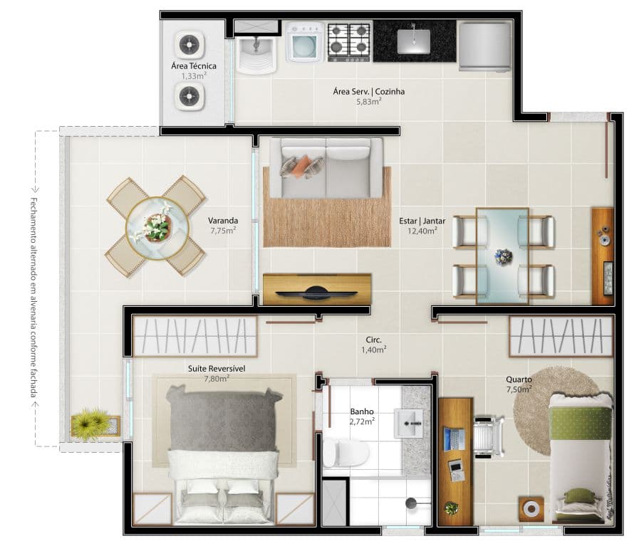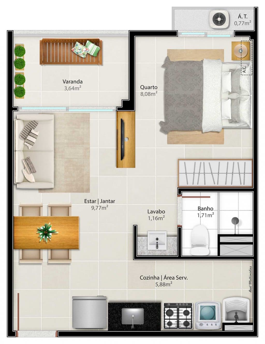 São 80 apartamentos, 52 unidades com 1 quarto e 28 unidades com 2 quartos, 2 elevadores, 1 ou 2 vagas de garagem, lazer montado e decorado. 4 lojas no térreo.